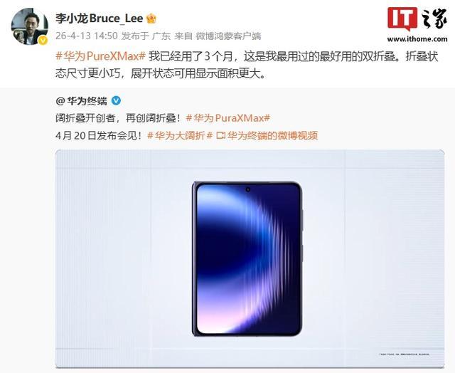 IT之家注意到,华为终端 BG CTO 李小龙今日发文“自曝”已经用了 Pura X Max 新机约 3 个月时间。他表示,这是自己用过的最好用的双折叠。折叠状态尺寸更小巧,展开状态可用显示面积更大。