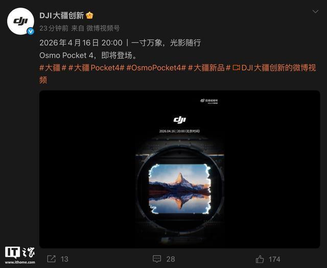 据IT之家此前报道,大疆 Osmo Pocket 4 系列运动相机将于 4 月 16 日 20:00 发布,产品主打“一寸万象、光影随行”。