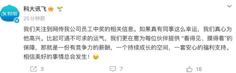 对此,科大讯飞官方回应称,“我们关注到网传我公司员工中奖的相关信息。如果真有同事这么幸运,我们真心为他高兴。比起可遇不可求的运气,我们更在意为每位伙伴提供“看得见、摸得着”的保障,那就是一份有竞争力的薪酬,一个持续成长的空间,一套安心的福利支持。相信美好的事情总会发生!”