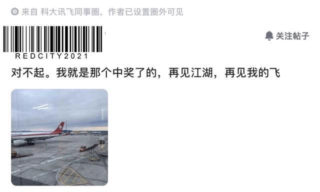 其表示,“对不起。我就是那个中奖了的,再见江湖,再见我的飞。”并配有机场现场照片。