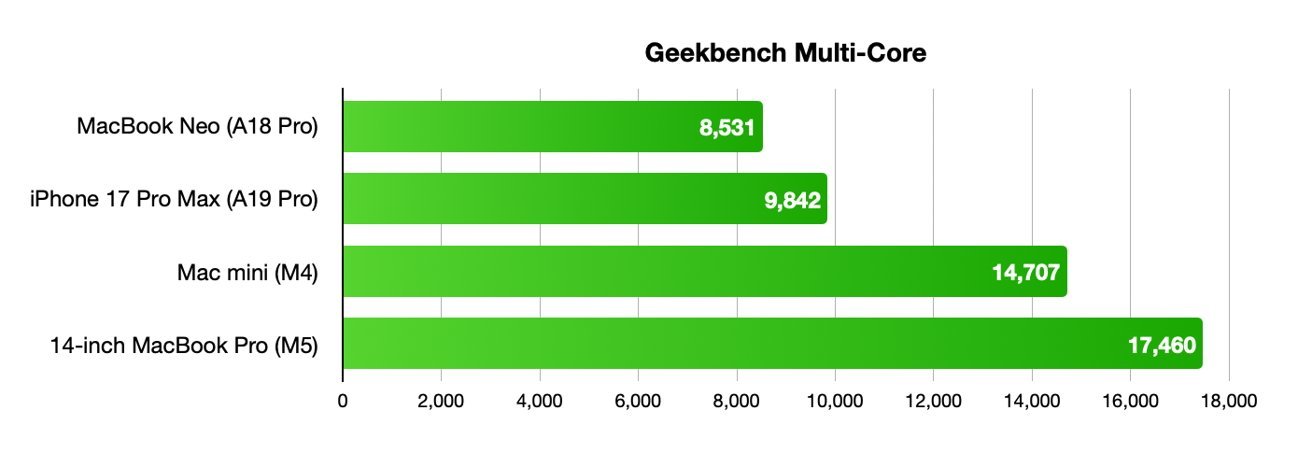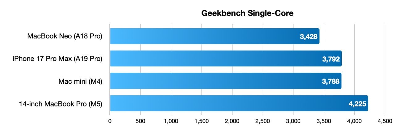 Geekbench 测试数据显示,MacBook Neo 的单核得分与 iPhone 17 Pro Max 及现款 Mac mini 差距在 10% 左右。