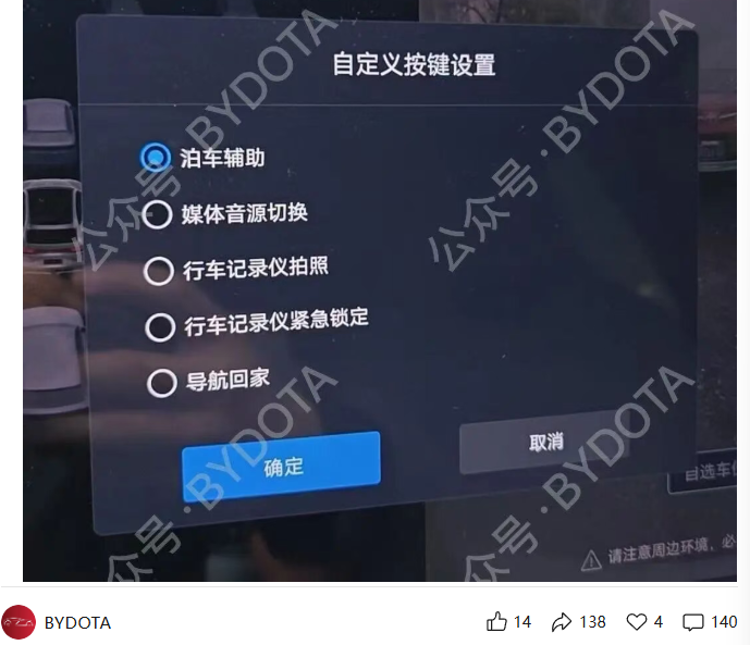 IT之家 4 月 14 日消息,据 BYDOTA 今日透露,比亚迪针对 DiLink 100 智能座舱车型的五视角行车记录仪及哨兵风险视频上传相关功能的适配工作已接近尾声。