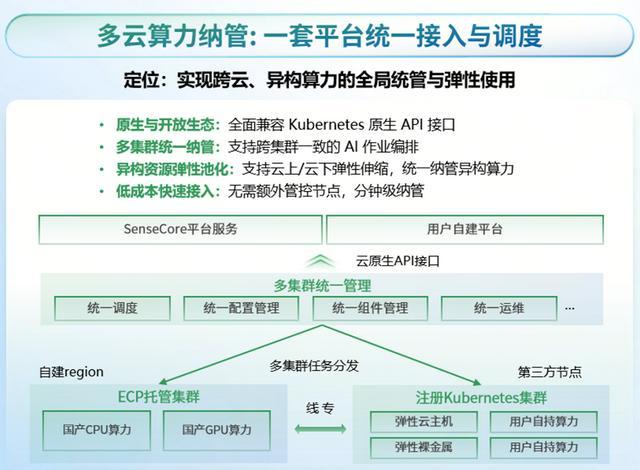 基于SenseCore AI云平台,商汤大装置实现了多云环境下的统一管理与异构算力调度,平台兼容Kubernetes原生生态,将自建集群、第三方云资源以及多种国产CPU/GPU算力整合为统一资源池。这种“算力池化”能力,使企业能够在不同区域、不同架构之间灵活调用资源,支撑大规模分布式推理任务。