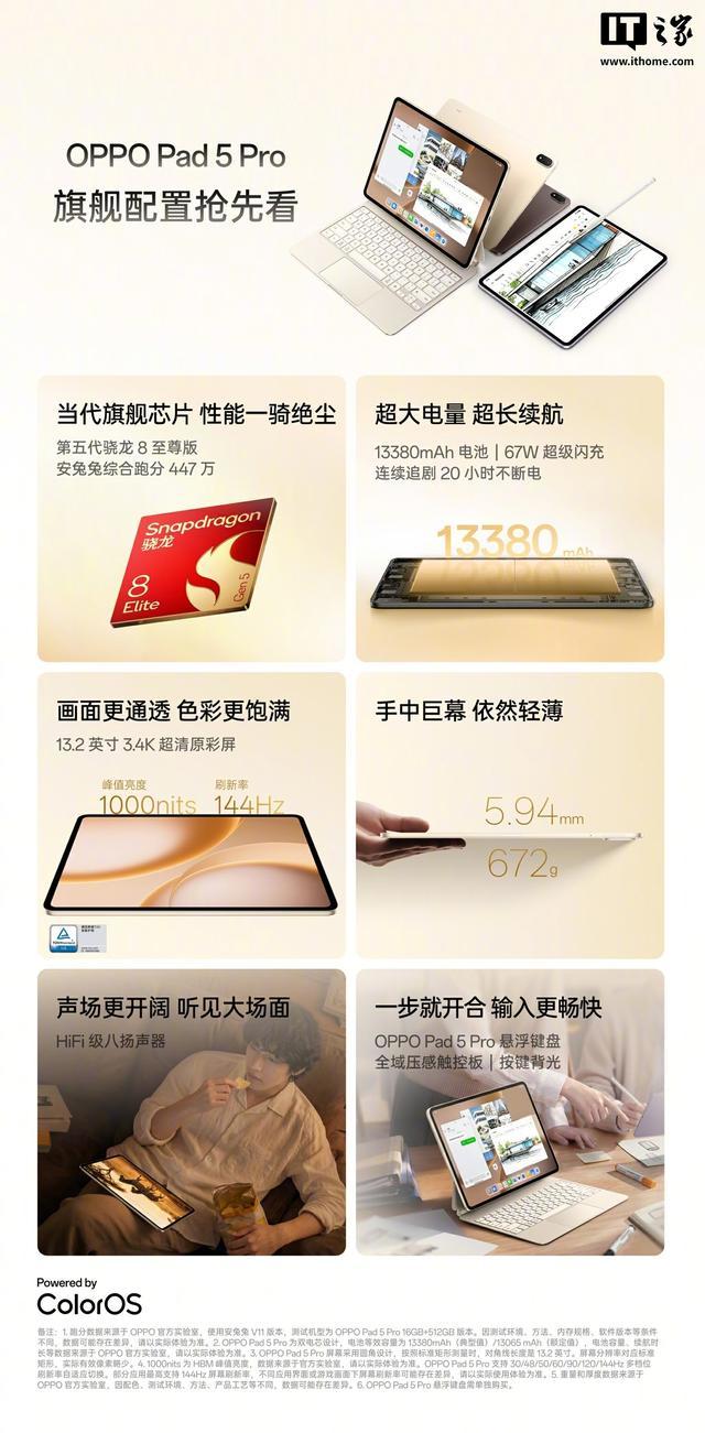 IT之家注意到,OPPO Pad 5 Pro 搭载当代旗舰芯片 —— 第五代骁龙 8 至尊版(安兔兔综合跑分超 447 万),内置 13380mAh 电池,同时支持 67W 闪充。