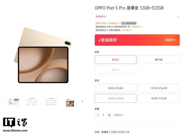 目前,OPPO Pad 5 Pro 平板目前已现身官网并公布了部分信息。相关页面显示,该平板将提供 8GB+256GB、12GB+256GB、12GB+512GB、16GB+512GB 四种规格。