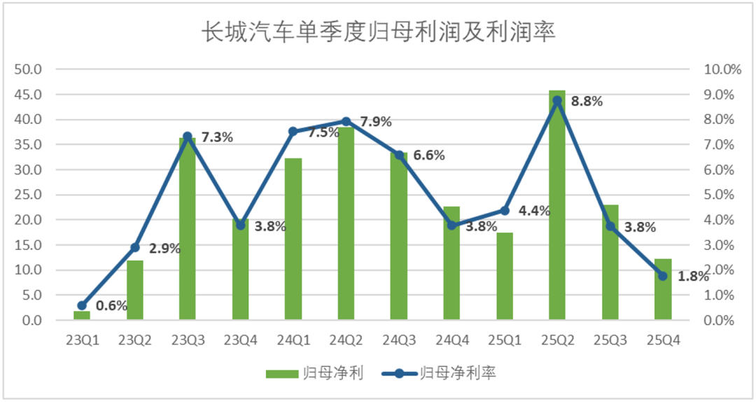 除毛利外,财报发布后最受关注的话题便是“增收不增利”。长城全年归母净利率仅4.4%,第四季度更是降至1.8%,创2023年第二季度以来新低。需注意的是,2025年计入损益的政府补贴达37.5亿元,若剔除该项,归母净利率将更低。