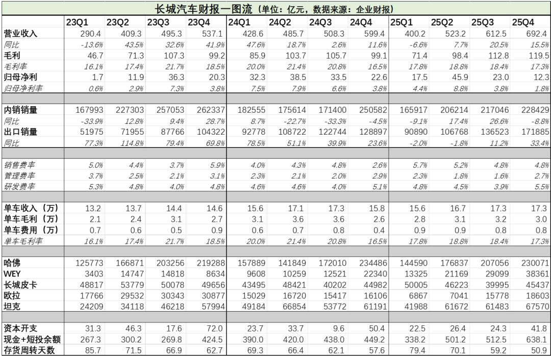 但若换一个视角观察,长城的处境或许并非简单的“落后”,而更接近一种主动选择的、带有鲜明魏建军印记的节奏——一种与丰田当年跨越周期的路径若合符节的“慢变量”逻辑。由此切入,我们将以长城汽车实际业绩为起点,结合财报背后隐含的战略动作,探讨其未来估值修复的空间与逻辑重估的可能性。