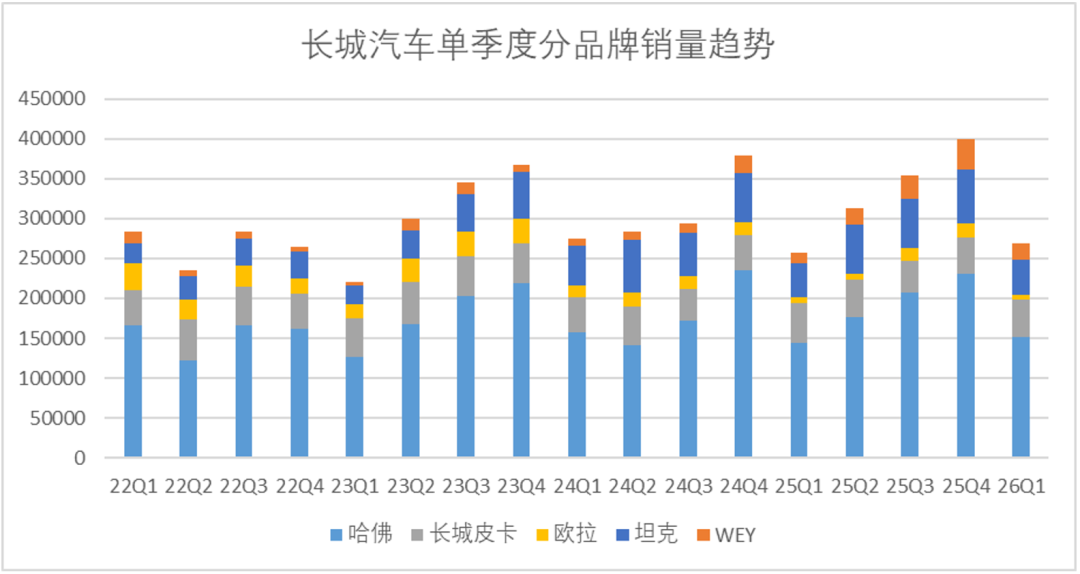 从绝对规模看,销量主力仍是定位更低的哈弗系列与高端的坦克系列。哈弗作为SUV赛道的长青品牌,其品牌力在国内及海外市场均经受过长期验证。坦克系列以燃油及混动硬派越野为切口,竞品有限,销量波动较小。