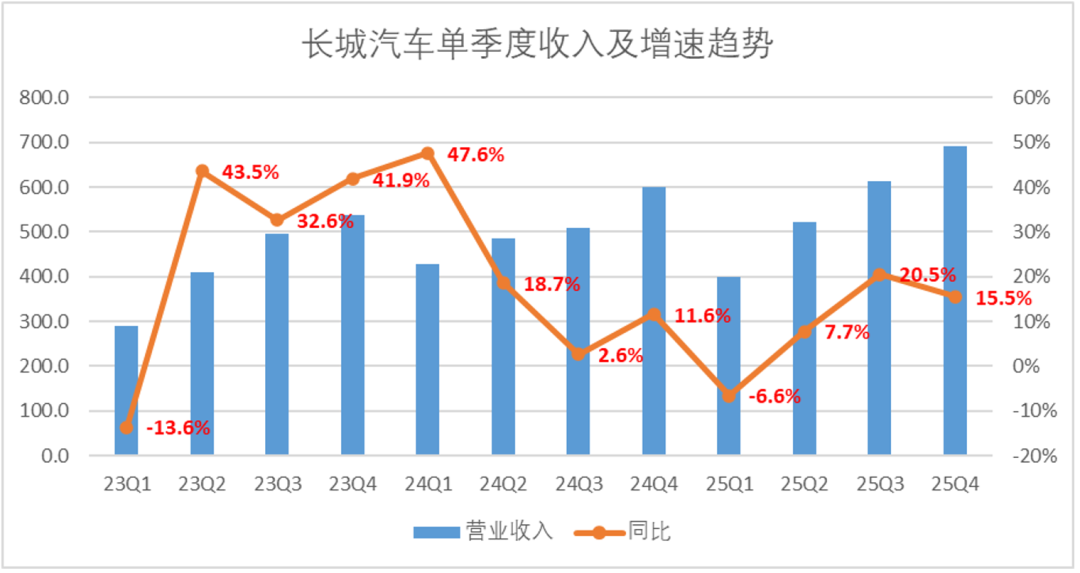 长城汽车2025年度营业收入2228.2亿元,同比增长10.2%;其中第四季度营收692.4亿元,单季同比增长15.5%。整体来看,下半年增速明显回暖,三四季度均录得15%以上增幅,扭转了上半年相对平淡的态势。