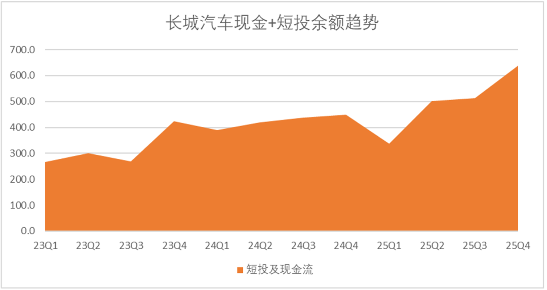 长城汽车的现金储备也相对充裕。截至2025年末,现金与短期投资合计约638亿元,居于行业第一梯队。存货余额较年初下降66亿元,存货周转天数由79天回落至50天左右常态水平。