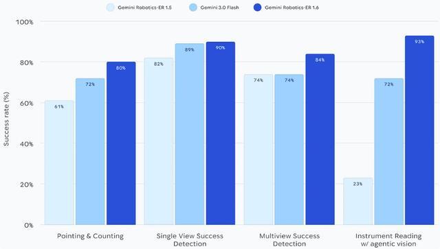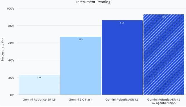 在仪表读数任务上,四种模型的成功率依次提升:Gemini Robotics-ER 1.5成功率为23%;Gemini 3.0 Flash成功率为67%;Gemini Robotics-ER 1.6成功率为86%;Gemini Robotics-ER 1.6(启用 agentic vision)成功率为93%。
