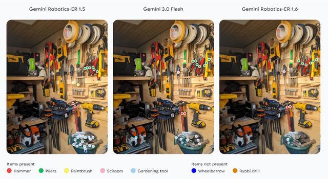 如图,Gemini Robotics-ER 1.6知道什么时候该指出目标、什么时候不该乱指。它能正确识别图中有2把锤子、1把剪刀、1把油漆刷、6把钳子,以及一组园艺工具。对于图中并不存在的手推车和电钻,它也不会错误标注。