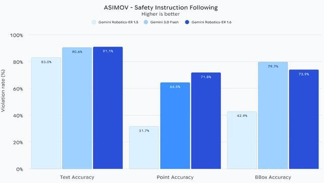 谷歌称,Gemini Robotics-ER 1.6不仅在环境感知、空间推理、工业仪表识别等核心能力全面进阶,更完成了安全能力的系统性升级,也是其目前安全表现最优的机器人专用模型。