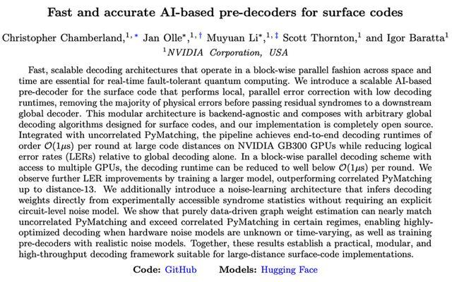 (2)Ising decoding(解码):两种用于预解码的3D CNN模型,分别针对速度或精度进行了优化,用于量子纠错的实时解码,分别拥有90万和180万个参数)。Ising解码模型的速度比当前开源行业标准pyMatching快2.5倍,准确度高3倍。