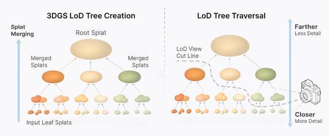 Spark 2.0的LoD设计采用了一种连续式LoD方法,所有泼溅都存在于一个层级结构中,即LoD泼溅树。Spark 2.0会沿着树的一个边界切割面单独选取泼溅,从而在视口内优化泼溅的细节。