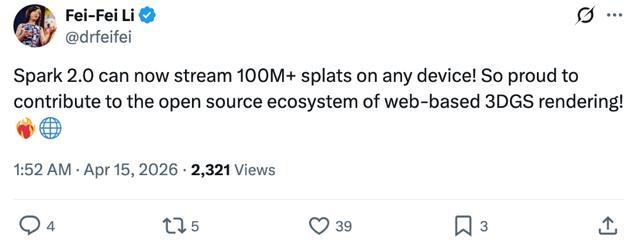 李飞飞本人在该成果发布的第一时间评论称:“Spark 2.0现在可以在任意设备上流式传输超过1亿个高斯泼溅!能够为基于网页的3DGS渲染开源生态做出贡献,我们感到无比自豪!”