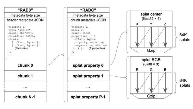 Spark2.0定义了一种新的文件格式.RAD(代表RADiance场),该格式能够压缩3DGS数据,并支持随机访问流式传输,从而在数据通过网络传输时实现渐进式细化。
