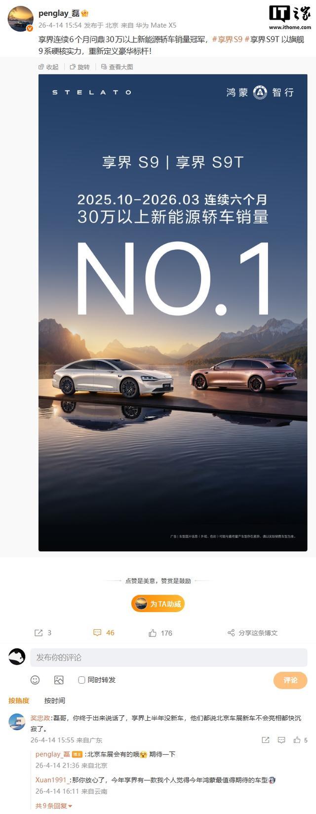 IT之家 4 月 15 日消息,在沉寂一小段时间后,华为智选车产品总监(享界系列)彭磊昨日在微博宣布,享界品牌连续 6 个月问鼎 30 万以上新能源轿车销量冠军。