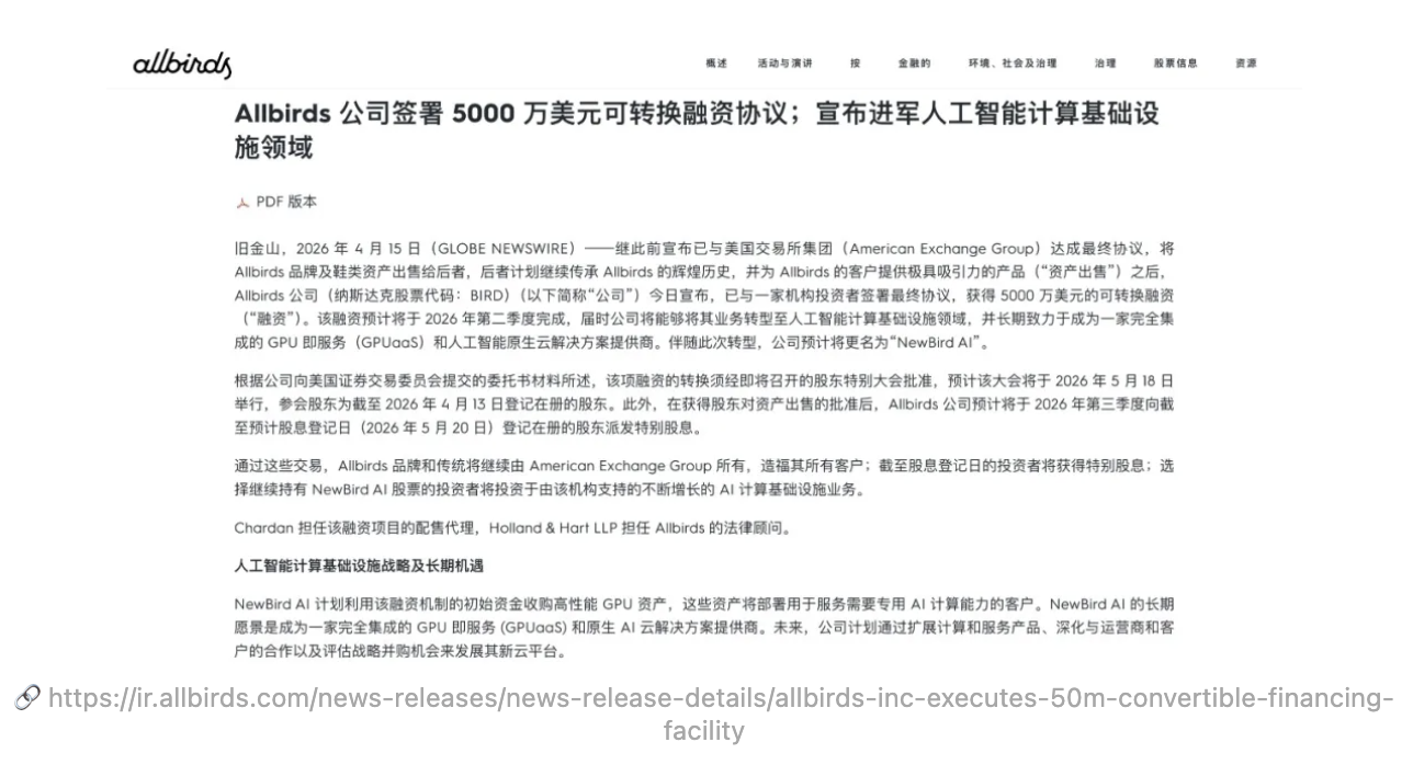 由于拟议中的 AI 算力业务「较少关注环境保护这一公共利益」,管理层正式请求股东批准删除公司章程中一切关于「为环境保护公共利益而运营」的相关表述。那个当年靠着绿色环保故事打动投资者的 Allbirds,连最后一块遮羞布也要摘掉了。这一切将提交至 5 月 18 日的股东大会进行表决,届时原有股东还将获得一笔特别股息作为补偿。