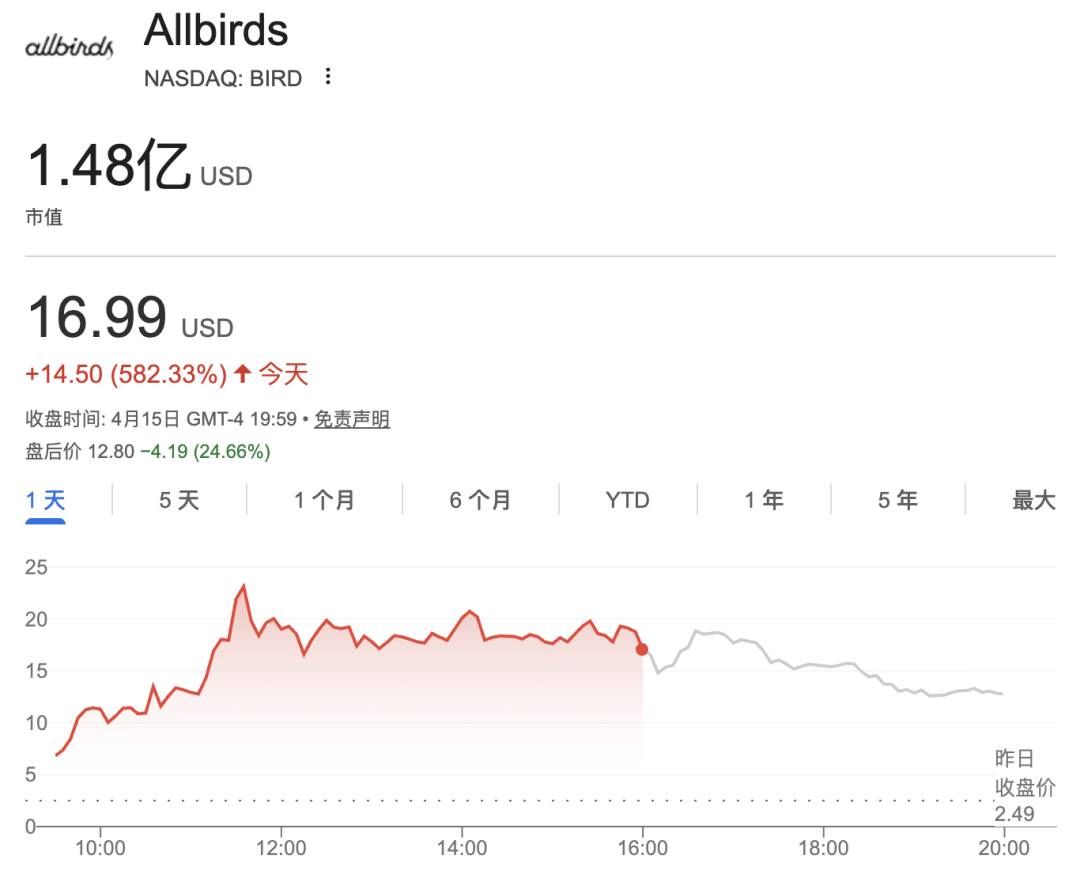 消息一出,沉寂已久的 Allbirds 股票就像是被注入了某种兴奋剂,开盘即暴涨,盘中一度飙升 721%,市值约为 1.845 亿美元,而就在前一天收盘时,它的总市值还不过区区 2100 万美元,每股股价徘徊在 3 美元以下。