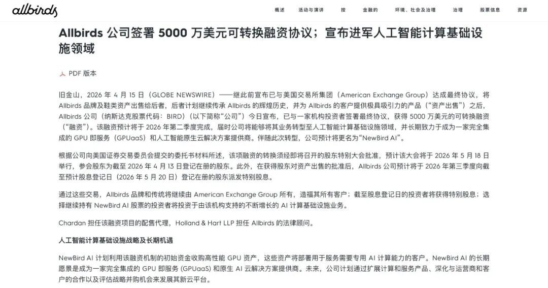 因此,与其说 Allbirds 是为了解决算力短缺的行业痛点,更不如说这是一场利用上市公司的壳资源,精准收割市场情绪的资本游戏。