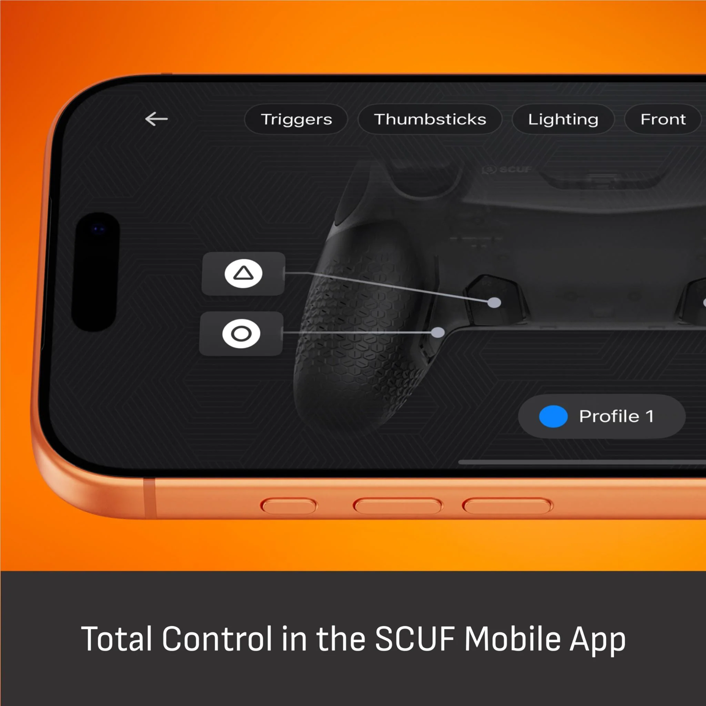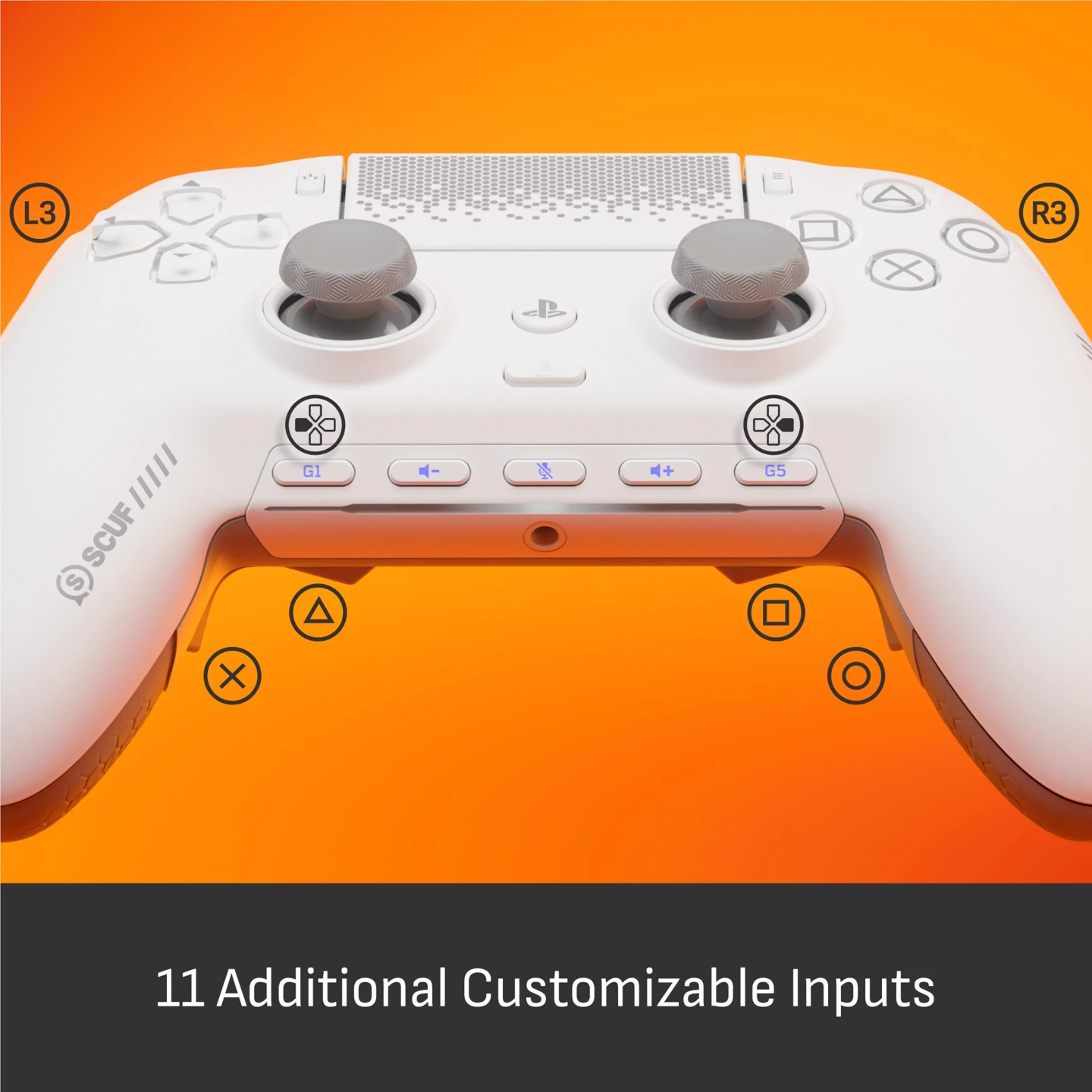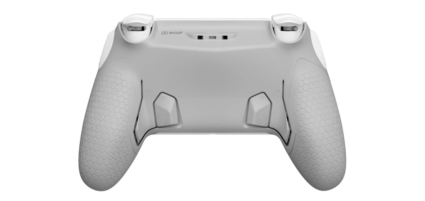 背部布局延续 Scuf 经典风格:4 个背键、2 个侧键、5 个 G-Keys 快捷键,总计 11 个可编程输入按键,玩家通过手机 App 进行按键映射。