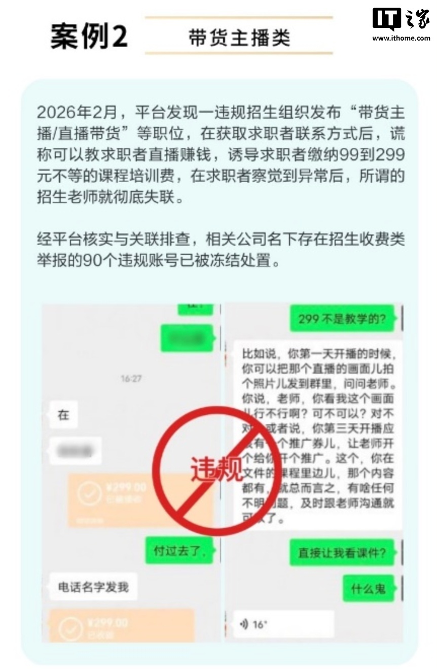 IT之家 4 月 16 日消息,BOSS 直聘今天发布公告,披露近期业界出现大量“招转培”骗局,许多不法团伙刊载职位招聘贴文,其中写有“大专生零基础也能做,做完 10 部漫剧就能转正”“新手第一部剧一般能赚 10 万”等话术,然而这些贴文实为付费卖课“割韭菜”套路,不知情的求职者投递简历后,不法团伙便会利用话术要求其交钱“入股”“学习”诈骗钱财。
