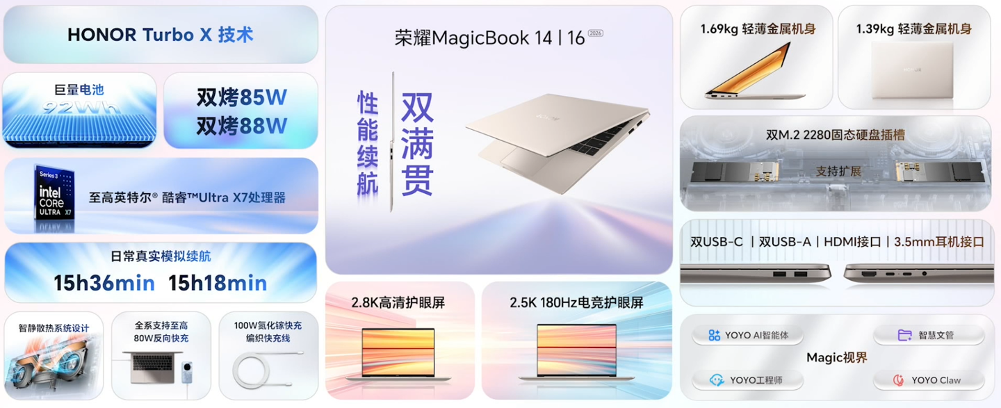 此外,MagicBook 14/16 2026 款笔记本是荣耀首款“养虾本”,搭载荣耀 YOYO Claw。