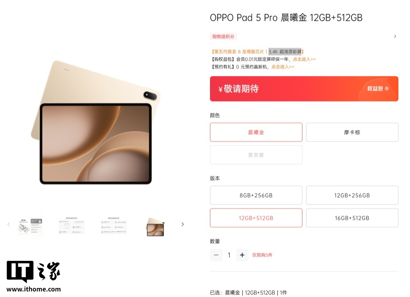 目前,OPPO Pad 5 Pro 已现身官网并公布了部分信息。相关页面显示,该平板将提供 8GB+256GB、12GB+256GB、12GB+512GB、16GB+512GB 四种规格。新机还拥有悬浮键盘和手写笔配件,不过两款配件需要单独购买。