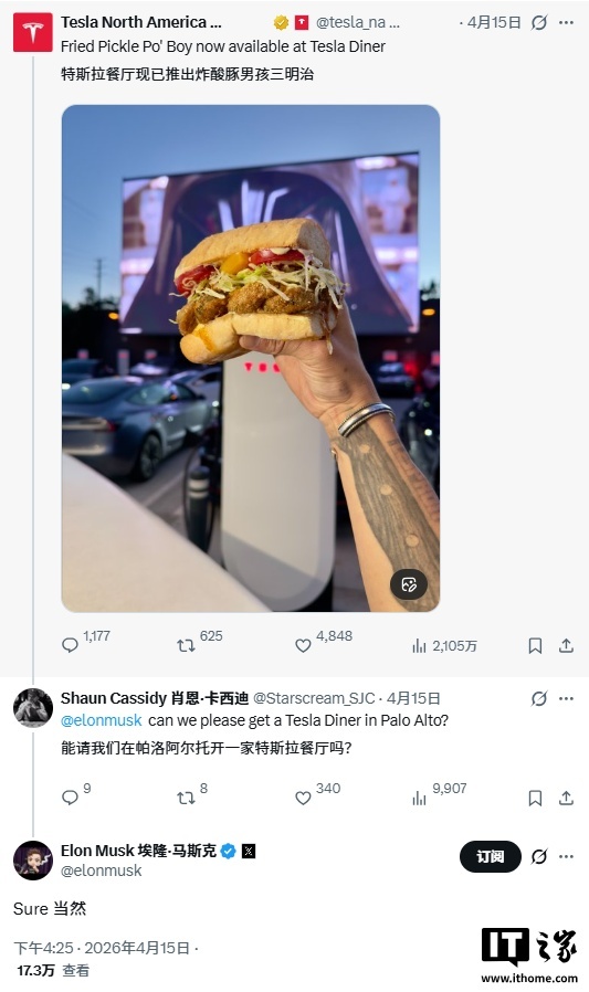 IT之家注意到,马斯克昨日证实,特斯拉将在美国北加州帕洛阿托开设一家全新的餐厅。