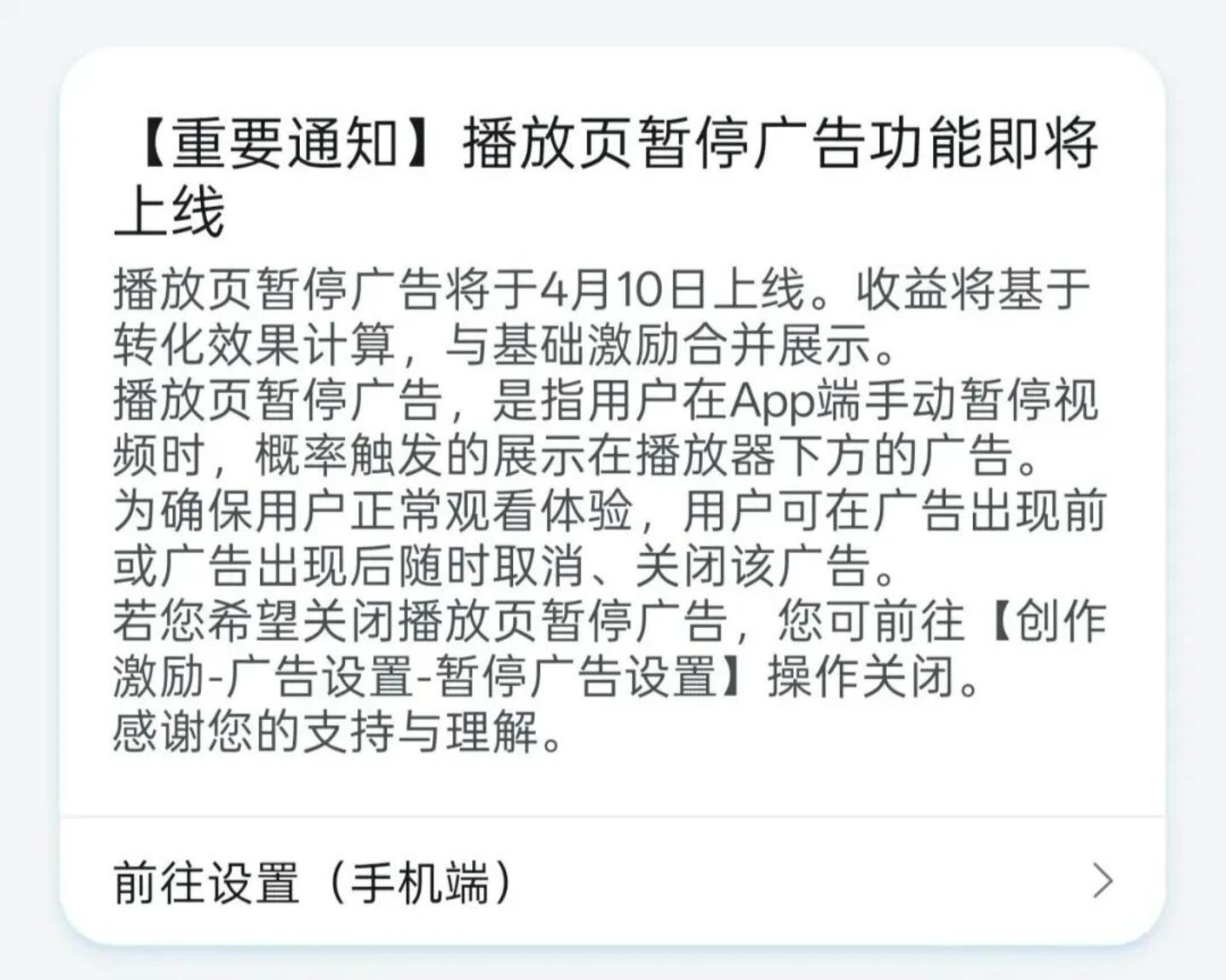 用户在手机上观看视频时点击暂停,有一定概率会在播放器下方弹出一条广告,不遮挡画面、可一键关闭。单从产品形态来看,这比长视频平台动辄120秒的贴片广告温和得多。