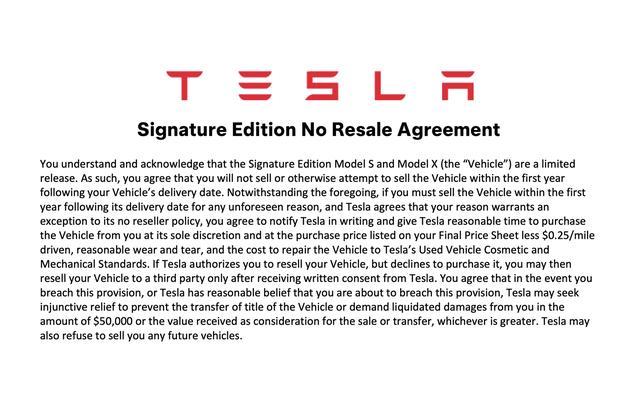据外媒 Not A Tesla App 曝光的订单文件显示,购买最后一批 Model S Plaid 与 Model X Plaid 签名纪念版的用户,在提车前必须签署一份严格的禁止转售协议。车主需承诺在车辆交付后的第一年内,不得出售、甚至不得尝试出售该车。一旦违约,车主将需支付 5 万美元(IT之家注:现汇率约合 34.2 万元人民币)违约金,或赔偿其转售获利金额,以两者中数额更高者为准。