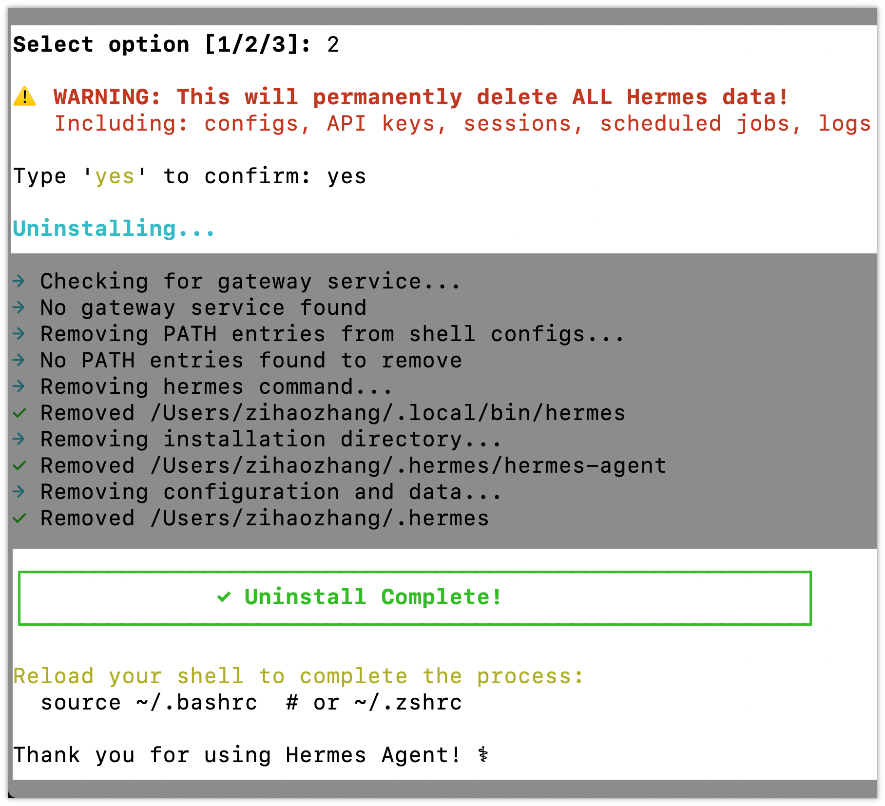 如果仍然不放心,回到初始的终端页面,执行下面这三行命令,也会将电脑上所有关于 Hermes Agent 的内容全部删除。