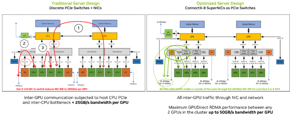 所以ConnectX-8将PCIe Gen6交换能力与高速网络能力整合到单一器件中,可替代传统离散PCIe Switch,既优化GPU到GPU、GPU到NIC的数据路径,也降低系统复杂度、功耗和总体拥有成本。