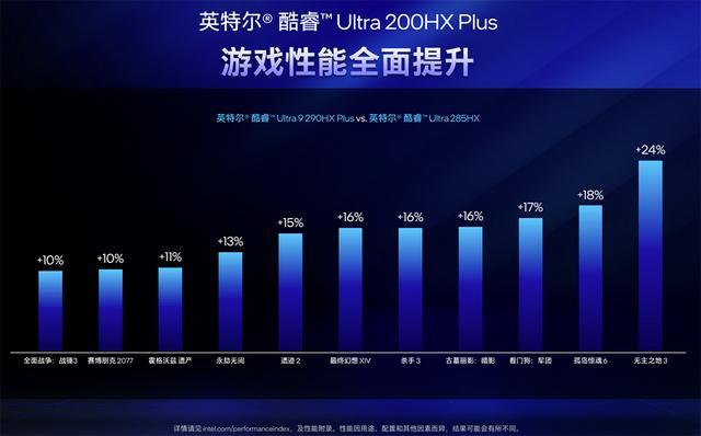 相比上一代平台,新一代酷睿Ultra 200HX Plus处理器在3A大作和热门竞技游戏中都实现了显著提升,平均提升15%,好的情况能到24%。