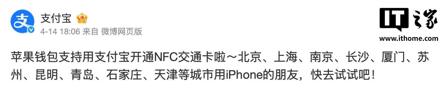 苹果钱包支持用支付宝开通NFC交通卡,覆盖北京、上海、南京等 IT之家 4 月 16 日消息,支付宝于 4 月 14 日发文宣布,苹果钱包支持用支付宝开通 NFC 交通卡,覆盖北京、上海、南京、长沙、厦门、苏州、昆明、青岛、石家庄、天津等城市。 IT之家附具体开通步骤如下: 苹果钱包点击“+”进行添加交通卡操作(iOS 26.1 以上用户) 选择“交通卡” 选择“支付宝”方式 确认打开“支付宝”并完成添加卡片操作 添加完成,在苹果钱包即可看到对应城市卡片 Published by 风君子 独自遨游何稽首 揭天掀地慰生平 View all posts by 风君子