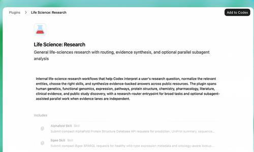 OpenAI Codex 的「Life Science: Research」插件,提供覆盖多领域的生命科学研究工作流,支持路由、证据合成与并行子代理分析