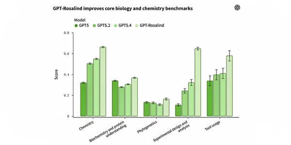 GPT-Rosalind 在化学、实验设计与分析等关键任务上的得分均明显优于前代模型