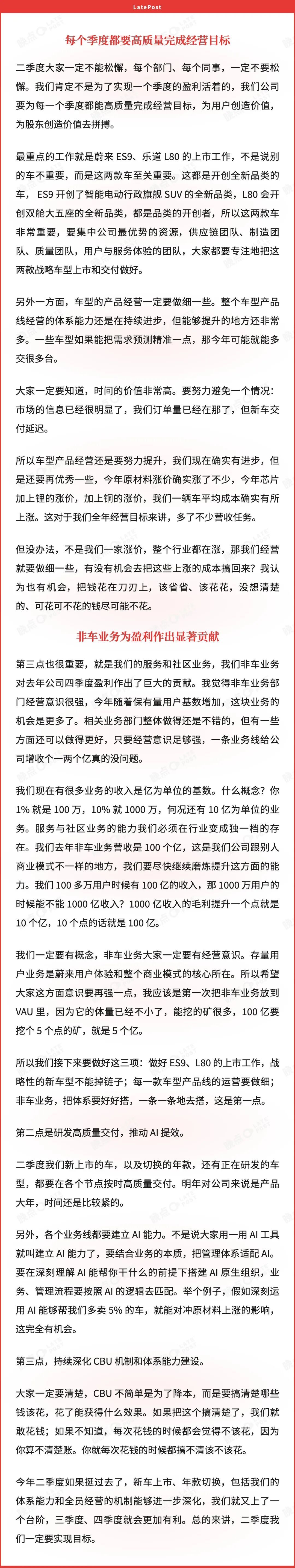 在 2025 年四季度首次盈利的同时,蔚来去年全年仍亏损超过百亿元。李斌昨天也提到,蔚来不是为了实现一个季度的盈利活着,而是要为每一个季度都能高质量完成经营目标,为用户和股东创造价值去拼搏。因此除了把车卖好,蔚来需要保持之前的运营节奏、控制费用。李斌称,蔚来要把钱花在刀刃上,“该省省、该花花,没想清楚的、可花可不花的钱尽可能不花”。