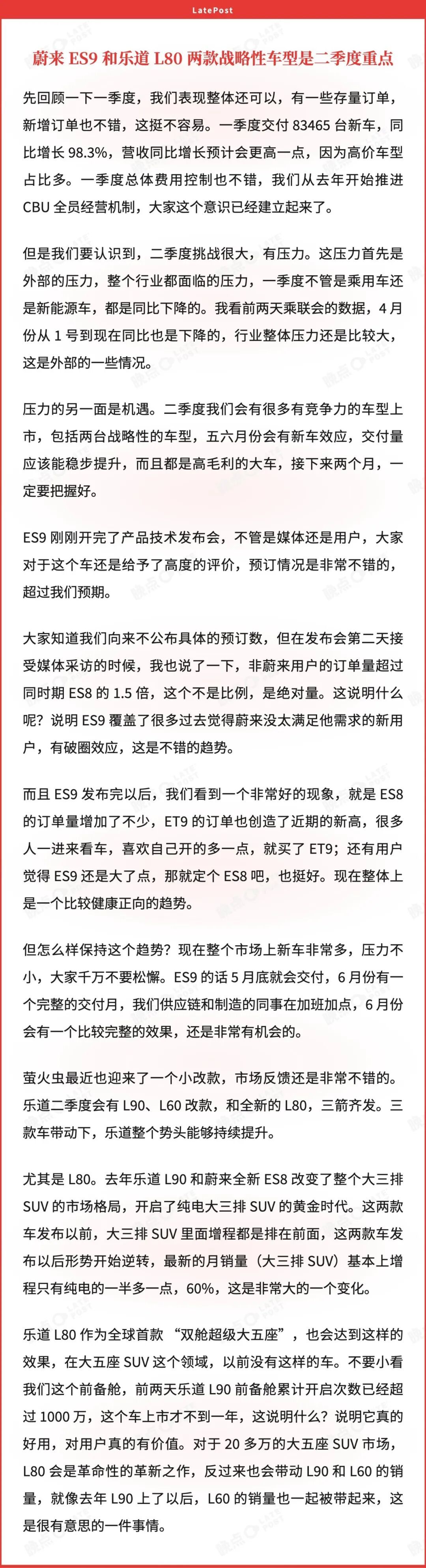 除蔚来 ES9 外,大五座 SUV 乐道 L80 也将于二季度发布。今年 1 月乐道品牌单月交付 3481 辆,同比下降 41%、环比下降 62%,为品牌推出以来月度新低,3 月回升至 6877 辆。L80 的登场将是拉回销量曲线的关键。李斌也把 ES9 与 L80 的销量表现视为二季度业绩的关键胜负手,“这两款车非常重要,要集中公司最优势的资源,二季度我们一定要实现目标。” 他同时提出,蔚来要努力避免新车上市后交付跟不上订单的情况。