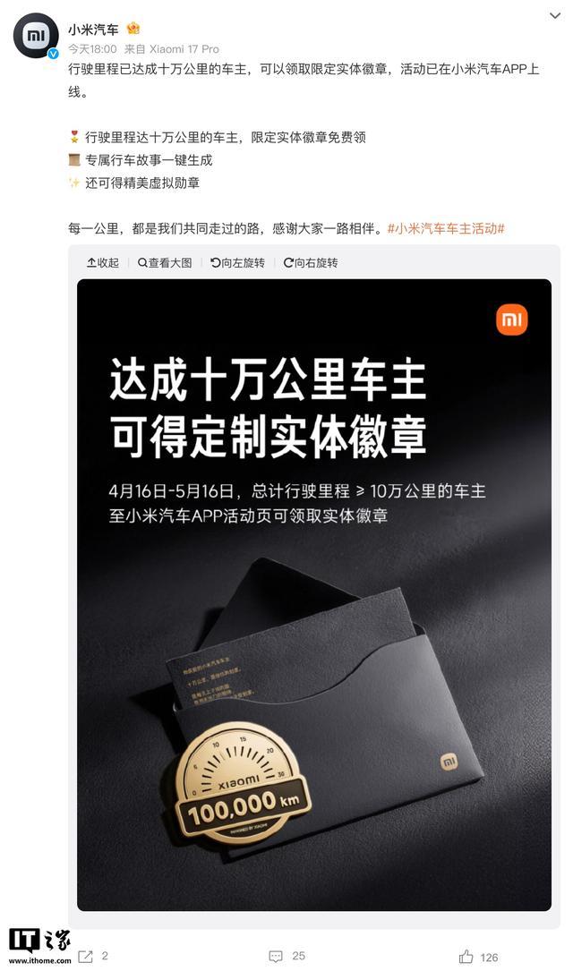 小米汽车:达成10万公里行程车主可限时领取定制实体徽章 IT之家 4 月 17 日消息,小米汽车发文,宣布自 4 月 16 日至 5 月 16 日,总计行驶里程达成 10 万公里的车主可以在小米汽车 App 活动页领取实体徽章,同时可获得专属行车故事总结。 IT之家获悉,此活动面向所有达成里程成就的小米汽车车主开放,不限定购车时间,符合条件者在活动页面会显示领取入口。 公开信息显示,小米汽车自新车交付日算起,可享受 5 年 / 10 万公里整车质保及 8 年 / 16 万公里关键零部件质保。 Published by 风君子 独自遨游何稽首 揭天掀地慰生平 View all posts by 风君子