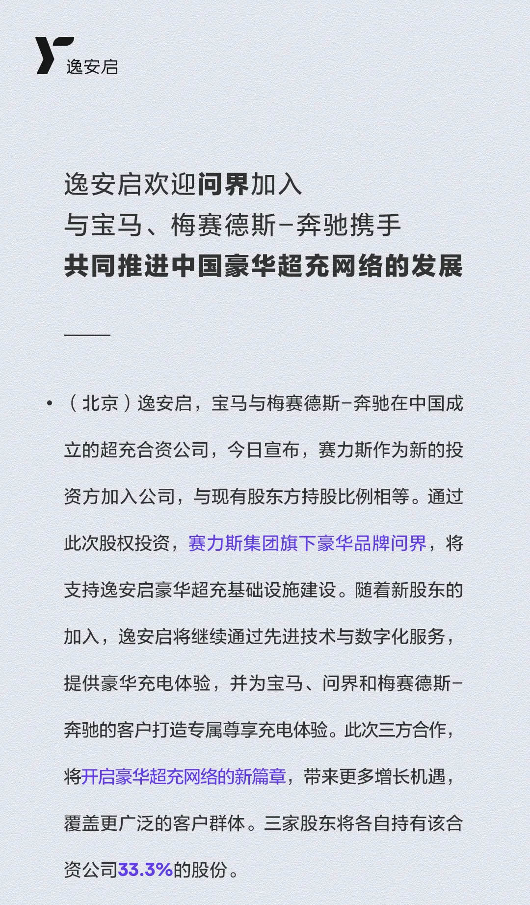 昨天,宝马与奔驰在中国成立的超充合资公司逸安启宣布,赛力斯作为新的投资方正式加入,与现有股东方持股比例相等,三家股东各持有该合资公司 33.3% 的股份。
