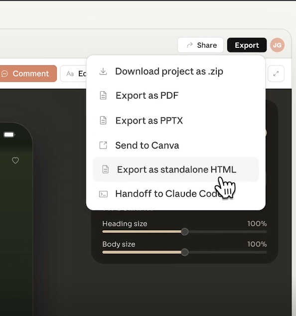 设计稿做完了,一键打包成handoff bundle(交接包),直接送到Claude Code实现。从设计到可运行的代码,中间没有任何人工环节。