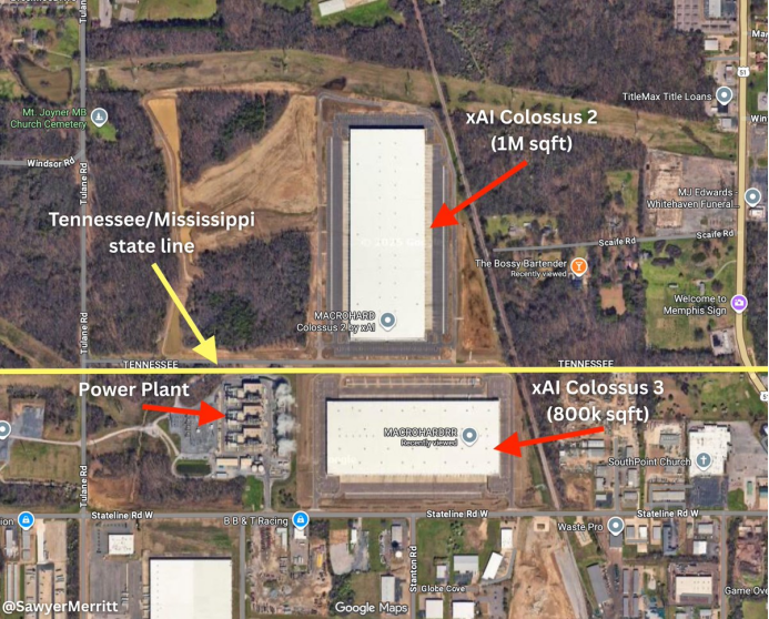 2026年1月,密西西比州长亲自宣布,xAI在Southaven投资超过200亿美元,建设Colossus 3(也叫MACROHARDRR)。这里其实紧挨着Whitehaven,就在州界对面,与此同时,xAI在这里的一处旧厂址建了天然气发电设施——先是27台临时涡轮机,后来申请扩到41台永久,用来给Colossus 2和3提供补充电力。