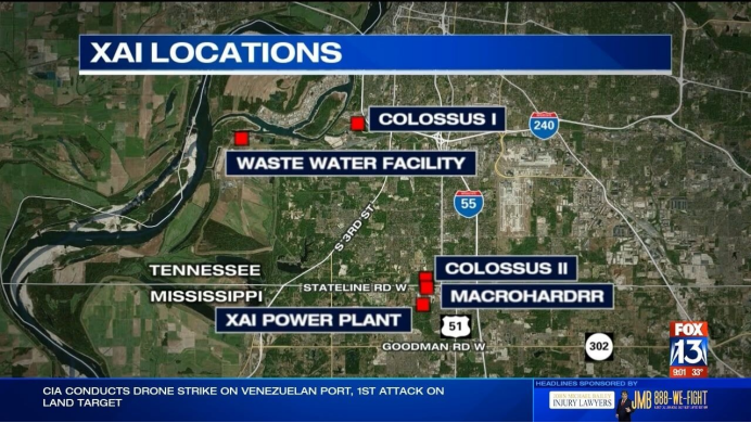 一期Colossus 1在孟菲斯Boxtown附近,最多用了35台未完全许可的发电机;二期Colossus 2则延伸到密西西比州Southaven(紧挨州界),安装了27台临时发电机。