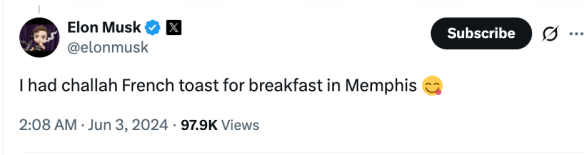 2024年6月的一个晚上,马斯克在X上发了一条看似随意的推文:“我在孟菲斯吃了犹太辫子面包做的法式吐司当早餐。”当时没人想到,这条早餐推文背后,正酝酿着一场改变孟菲斯命运的“奇迹”。