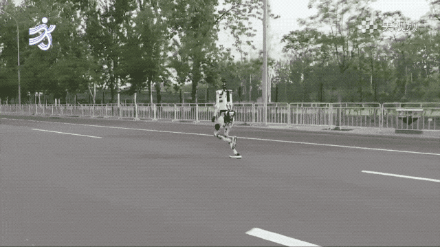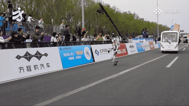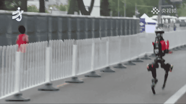 赛道上另一个名场面,真人跑者和机器人并肩竞速,结果机器人一个加速直接超过了人类选手。画面定格的那一刻,堪比一幅世界名画。