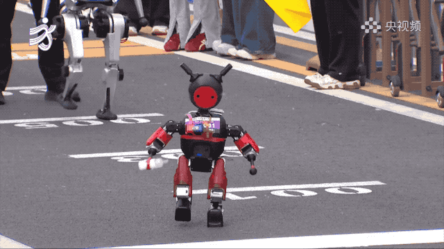 由于是间隔出发,前面的机器人已经跑完,后面的队伍还没发车。中段出现了一台小鼻嘎机器人,手里还拿着奶瓶,主打一个萌系赛道。话说身高这么矮的机器人,到了终点真能够得到撞线的那根线吗。