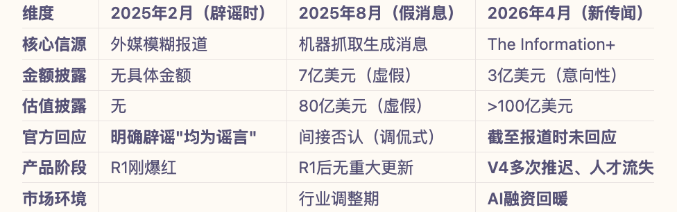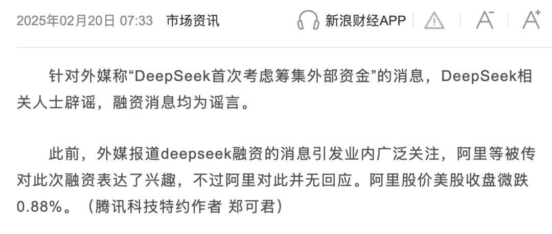 DeepSeek融资传闻并非首次出现,最早可追溯至2025年2月,当时的消息是“阿里巴巴等科技巨头被传表达投资兴趣”,DeepSeek明确回应“融资消息均为谣言”。