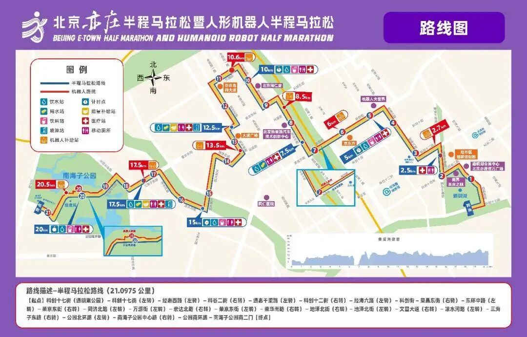 由于赛道环境相较去年更复杂。赛程全长 21.0975 公里,首次引入南海子公园生态路段,赛道融合平地、坡道、弯道、狭窄路段等 10 余种地形,12 个左转道、10个右转道,包含接近 90° 的弯道,十分考验机器人的路径规划与动态平衡能力。